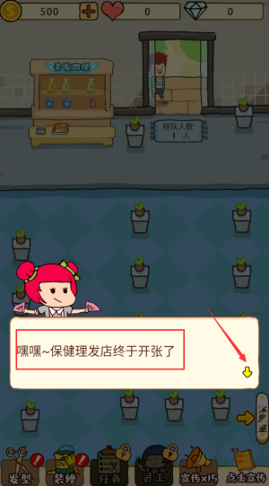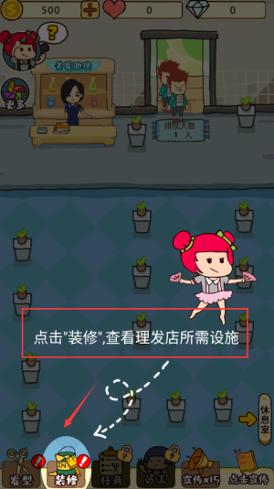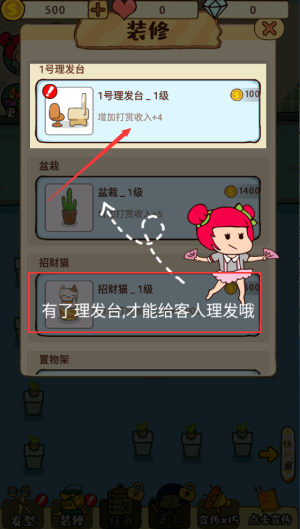 2、點(diǎn)擊紅框裝修按鈕,查看理發(fā)店設(shè)施升級需求。