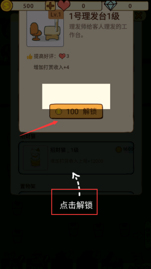 4、點(diǎn)擊紅框解鎖按鈕,支付100金幣啟用1號理發(fā)臺。