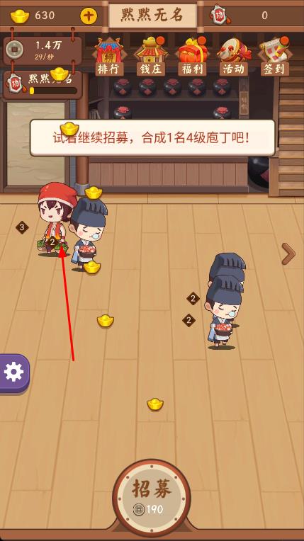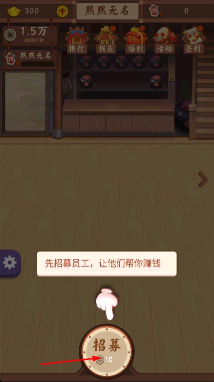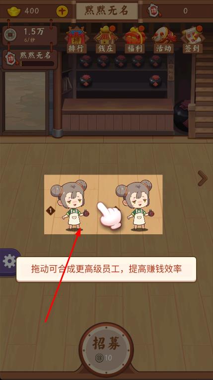 3、繼續(xù)點擊招募按鈕,不斷招募和合成員工,提升員工等級,在經營過程中,隨機掉落金幣,收集這些金幣,逐步擴大酒館經營規(guī)模。