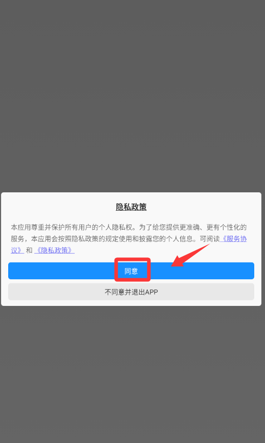 1、點(diǎn)擊隱私政策紅色框框的同意并進(jìn)入。