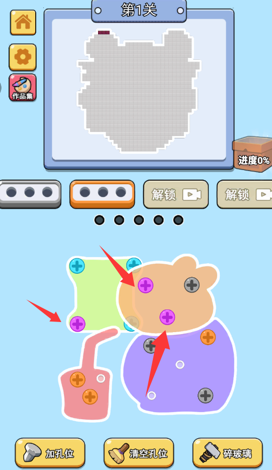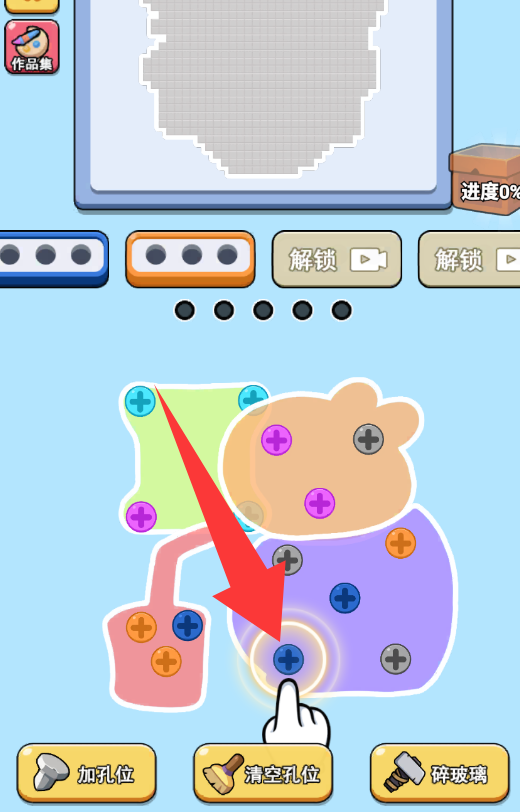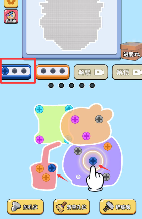 1、通過點(diǎn)擊選擇同色螺絲組,滑動(dòng)完成拆除操作。每拆除一組螺絲會(huì)顯露部分底圖,最終拼出完整圖案即為通關(guān)。