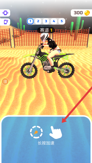 1、進(jìn)入賽道關(guān)卡1的游戲界面,需要長(zhǎng)按加速快速啟動(dòng)摩托車,開(kāi)啟與對(duì)手的摩托車競(jìng)技。