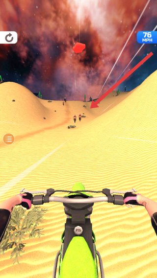 2、在比賽中需要緊盯前方騎手,調(diào)控摩托車的車速與行駛路線,嘗試超越前方的對(duì)手提升排名。