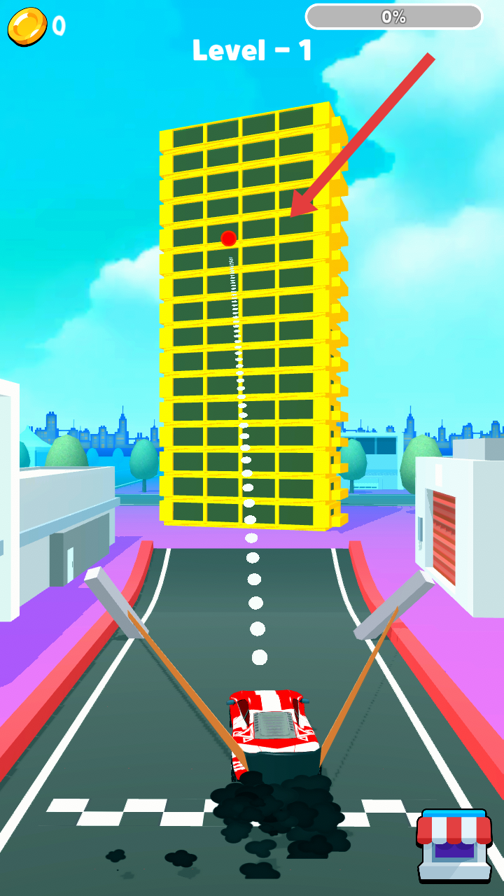 1、進(jìn)入游戲Level1關(guān)卡,需要后拖來進(jìn)行操控汽車對準(zhǔn)黃色大樓進(jìn)行粉碎,通關(guān)撞擊得分。