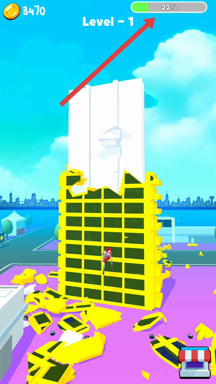 3、需要時刻關(guān)注頂部的進(jìn)度條,持續(xù)的撞擊大樓,直至進(jìn)度條充滿,完成Level1的破壞任務(wù)。