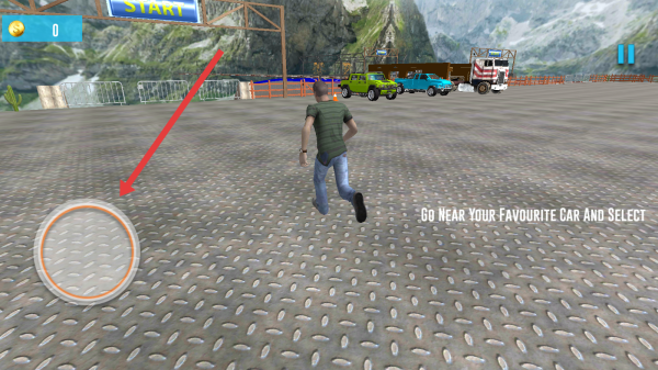 2、在游戲場景中,可以按照箭頭指向處,滑動左下角虛擬搖桿操控角色移動,前往心儀車輛處。
