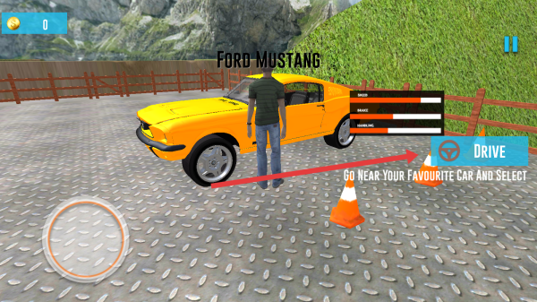 3、操控角色靠近黃色Ford-Mustang車后,通過點擊DRIVE按鈕,駕駛車輛開啟死亡飛躍挑戰(zhàn)。