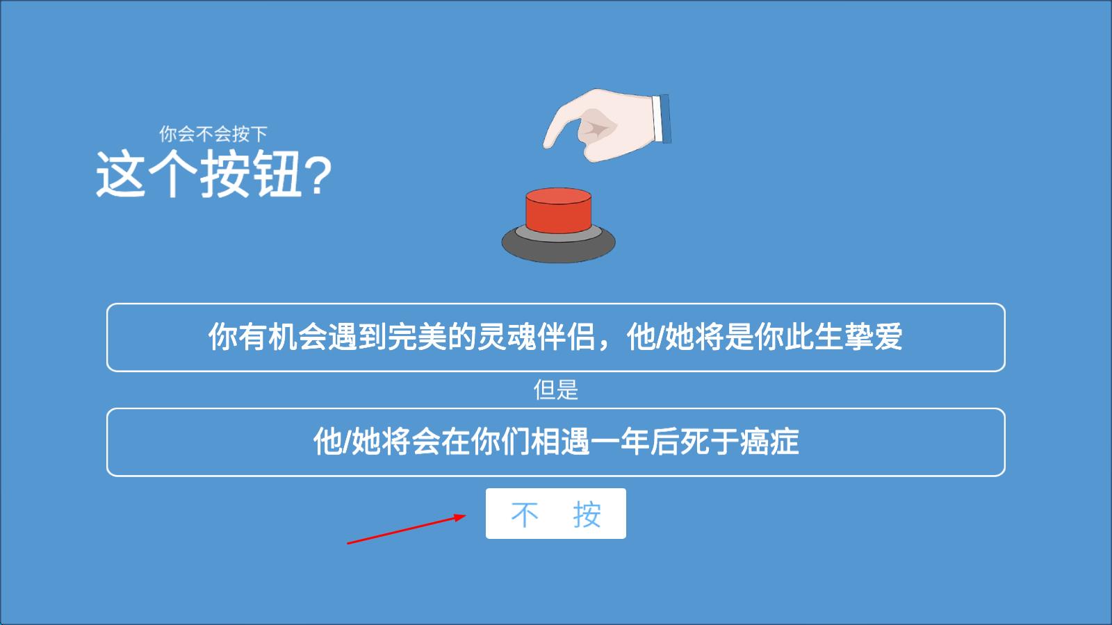 1、進(jìn)入游戲后,每輪開始屏幕會(huì)出現(xiàn)帶問題的提示框,中央有“按下”“不按”兩按鈕,需在限定時(shí)間內(nèi)做出選擇開啟挑戰(zhàn)。