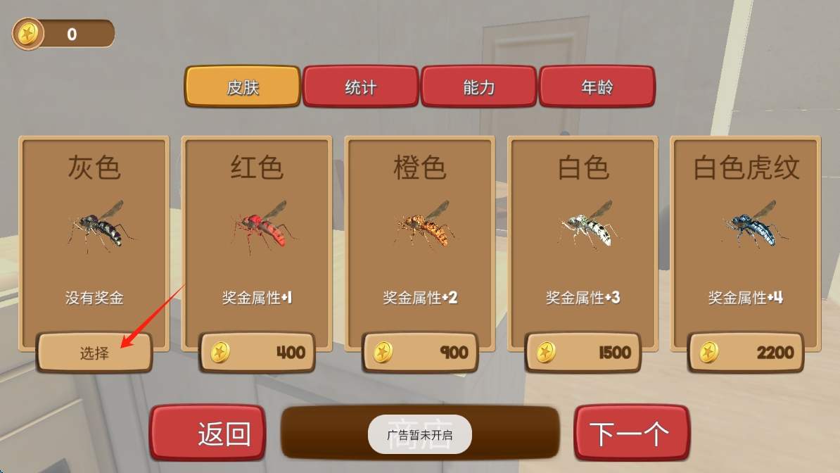 2、角色選擇時(shí),挑選喜歡的蚊子皮膚,不同皮膚對應(yīng)不同獎(jiǎng)金屬性,助力游戲進(jìn)程,點(diǎn)擊選擇。