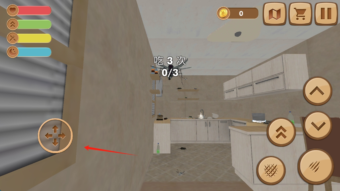 3、游戲中操控蚊子在房間活動(dòng),完成吃3次等任務(wù),注意生存狀態(tài),提升游戲體驗(yàn),撥動(dòng)輪盤移動(dòng)。