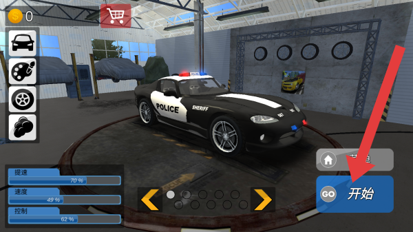 1、展示了一輛位于車(chē)庫(kù)或改裝車(chē)間的場(chǎng)景中,界面左側(cè)有汽車(chē)、涂裝等圖標(biāo),下方有極速、速度、控制等參數(shù)調(diào)節(jié)選項(xiàng),右下角有開(kāi)始按鈕。