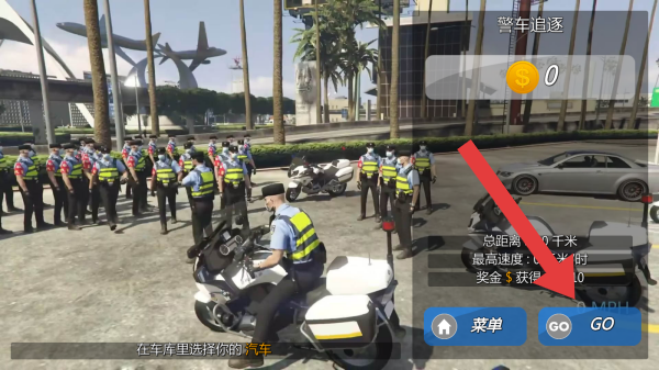 2、畫(huà)面呈現(xiàn)開(kāi)始前的選車(chē)界面,有島追商車(chē)輛信息含最高速度、獎(jiǎng)金等,點(diǎn)擊GO的按鈕,以及一群警察角色和警用車(chē)輛。