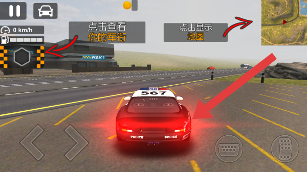 3、畫(huà)面中有警車(chē),界面有點(diǎn)擊查看你的軍銜、點(diǎn)擊顯示地圖等提示,還有速度顯示、暫停按鈕、車(chē)輛圖標(biāo),以及帶有POLICE標(biāo)識(shí)的建筑等。