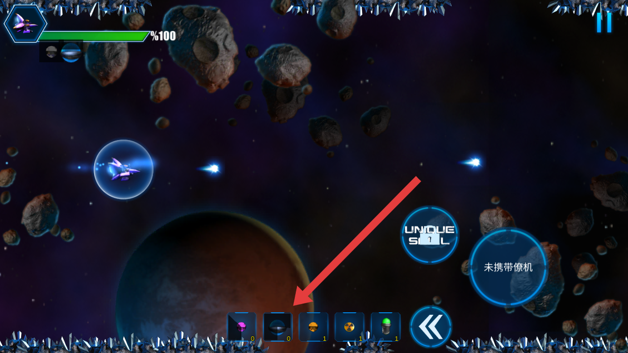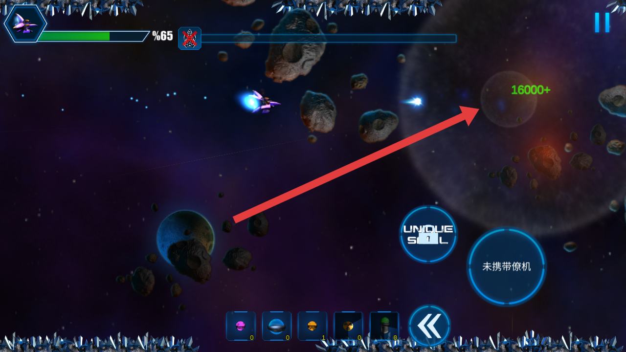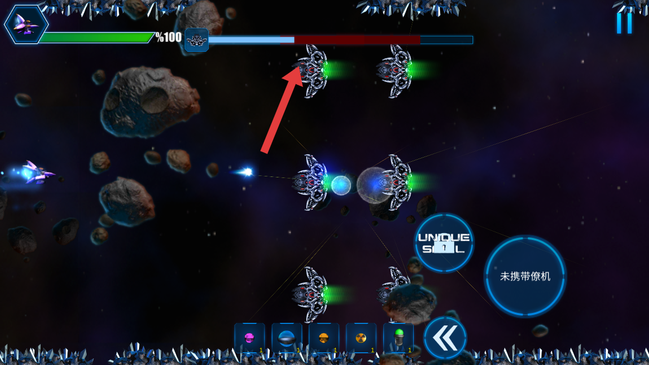 1、操控戰(zhàn)機(jī)瞄準(zhǔn)對面的全部敵方飛船,需要發(fā)射彈幕進(jìn)行攻擊,還需注意頭上的敵方血量條。