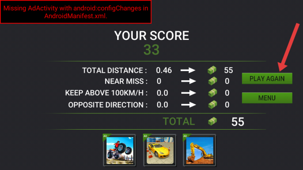 3、如果在駕駛道路上碰撞到其他車輛則失敗,結(jié)算后點(diǎn)擊PLAY AGAIN,重新挑戰(zhàn)改關(guān)卡。