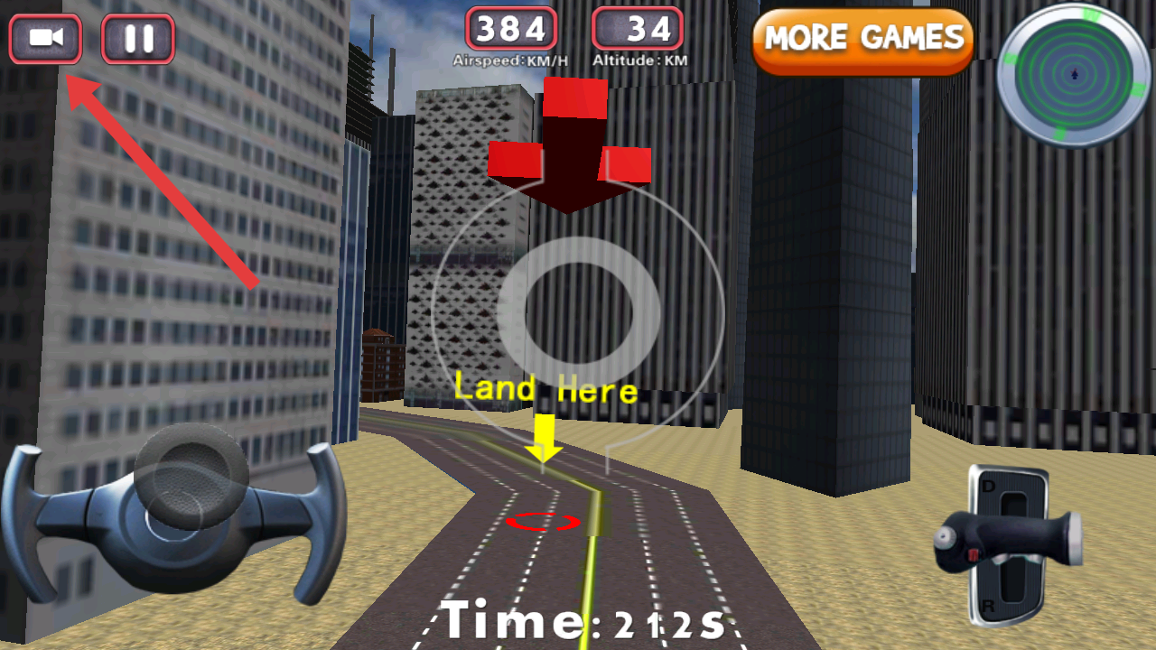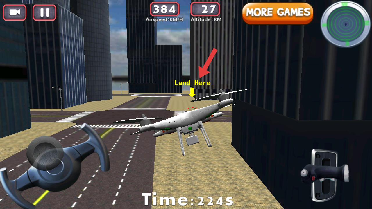 1、在操控?zé)o人機(jī)時(shí),需要依據(jù)Land Here的提示,來調(diào)整飛行方向與高度,精準(zhǔn)降落在指定區(qū)域。