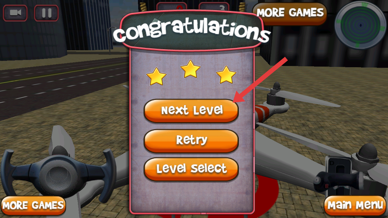 2、在游戲的關(guān)卡完成后,需要點(diǎn)擊Next Level的按鈕,進(jìn)入下一關(guān)更有難度的無人機(jī)起降挑戰(zhàn)。