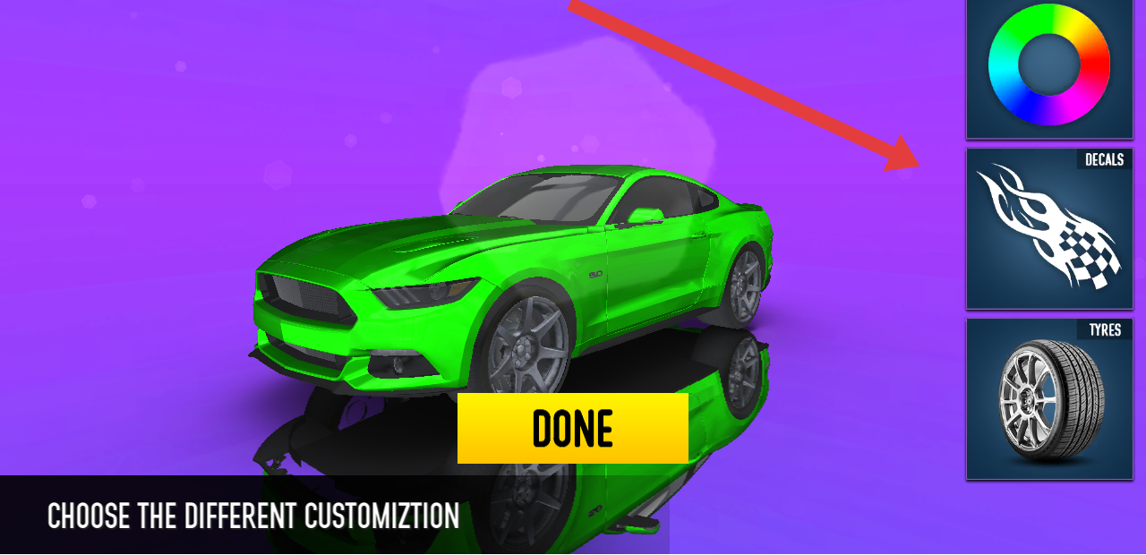1、在車輛自定義界面,點擊右側DECALS的選項,可以為賽車添加火焰等貼紙,打造獨特外觀。