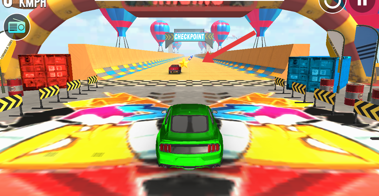 2、進入賽道后,操控賽車朝箭頭指向的CHECKPOINT進行沖刺,超越前方車輛并拾取星星和道具。