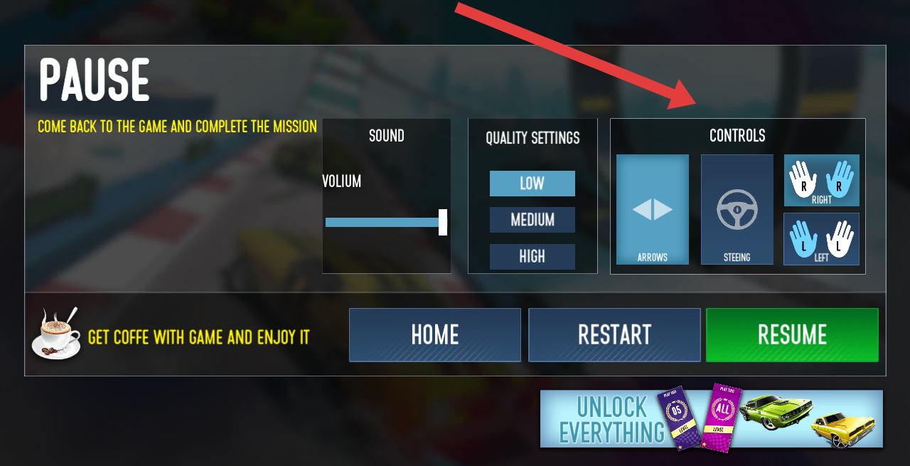 3、暫停游戲時,在CONTROLS區(qū)域選擇操作模式如箭頭、方向盤,適合自己的操控習慣。