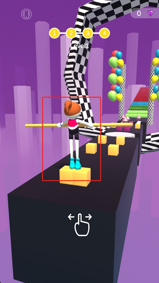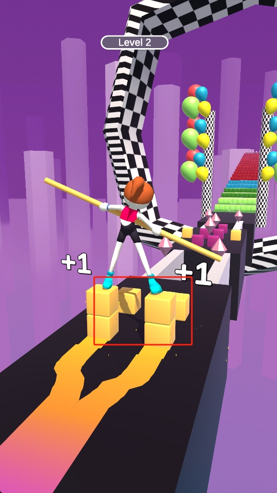 2、我們需要跨越間隔方塊,通過滑動精準(zhǔn)控制平衡桿長度與角度,讓角色雙腳落于方塊即可。