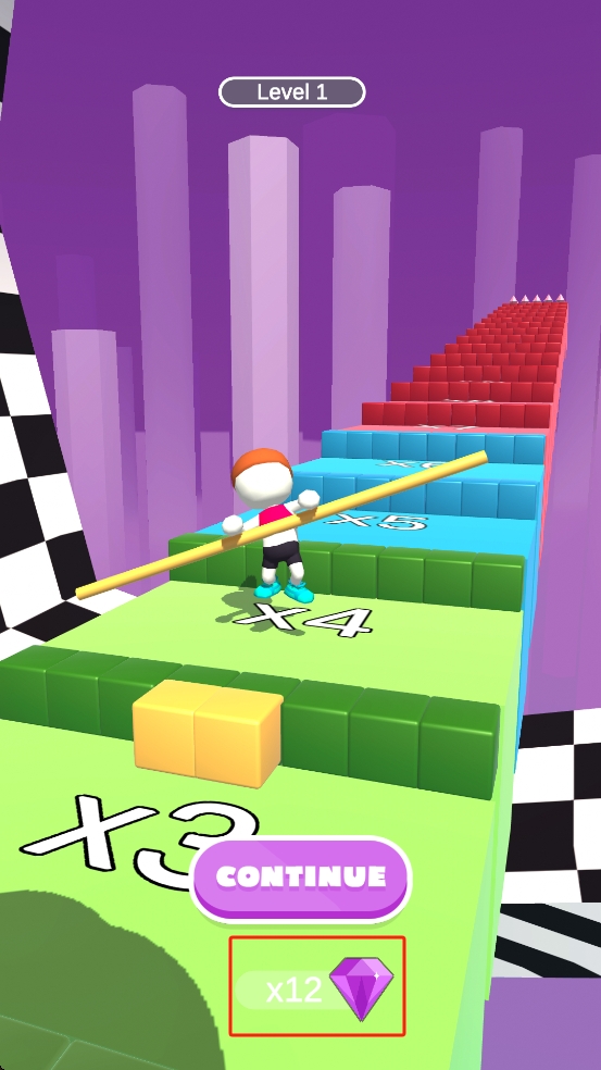 3、成功抵達(dá)關(guān)卡終點時,界面顯示CONTINUE按鈕,點擊可繼續(xù),下方紅框是獎勵的12顆鉆石,可用于解鎖皮膚、道具等。