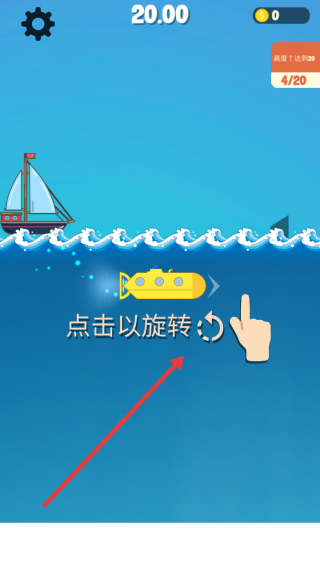 1、初始界面點(diǎn)擊黃色潛艇,按點(diǎn)擊以旋轉(zhuǎn)提示調(diào)整角度,借彈跳力從海面下啟動(dòng),開(kāi)啟海洋跳躍挑戰(zhàn)。