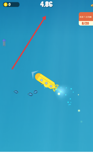 2、游戲中持續(xù)點(diǎn)擊旋轉(zhuǎn)潛艇,借彈跳調(diào)整方向,避水母、收小魚(yú),積累上升高度,推進(jìn)至更高層數(shù)。