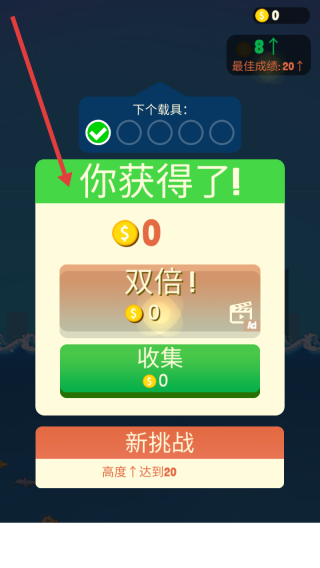 3、挑戰(zhàn)結(jié)束,界面顯獎(jiǎng)勵(lì)金幣、雙倍,點(diǎn)收集領(lǐng)獎(jiǎng)勵(lì),或選新挑戰(zhàn)再?zèng)_高度、刷新最佳成績(jī)。