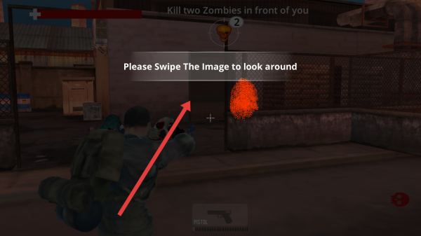 1、按照屏幕中的提示滑動(dòng)屏幕觀察周圍,發(fā)現(xiàn)前方僵尸,準(zhǔn)備用手槍完成擊殺任務(wù)。