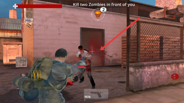 2、根據(jù)前面教學(xué)操控角色移動(dòng),瞄準(zhǔn)前方僵尸射擊,命中消滅目標(biāo),達(dá)成Kill-two-Zombies的任務(wù)要求。