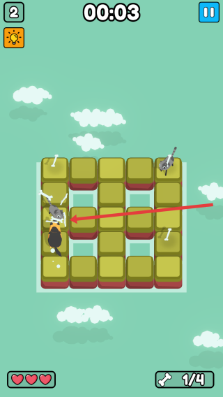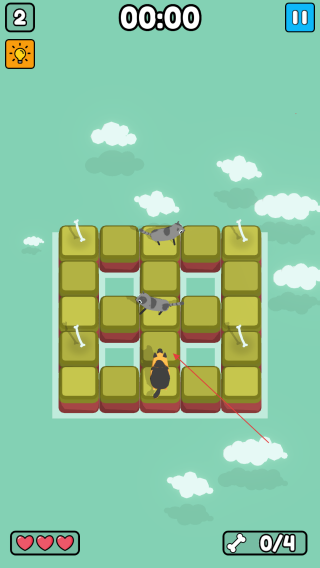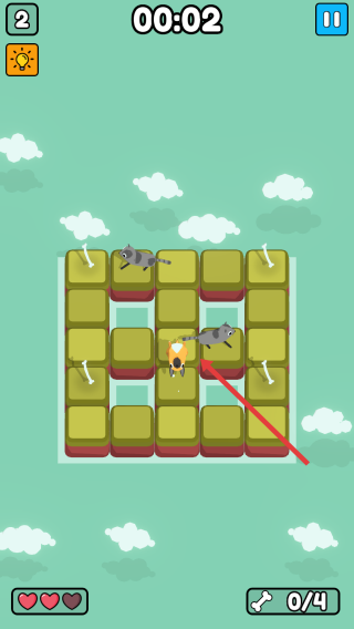 2、注意上方時間的限制,需要規(guī)劃最短的路徑,優(yōu)先拿角落骨頭,避免被貓包圍,保持血量愛心。