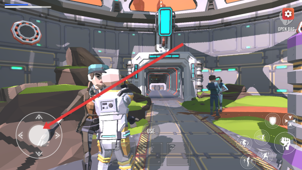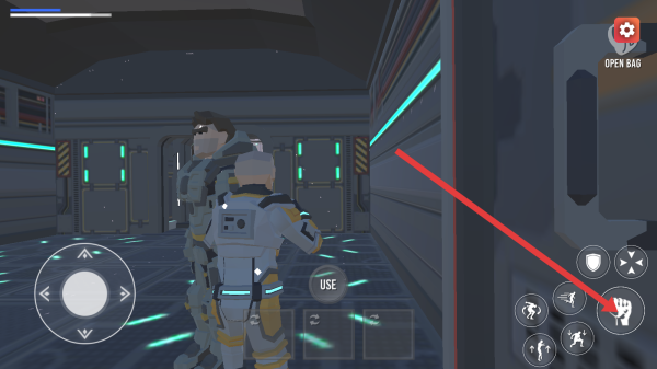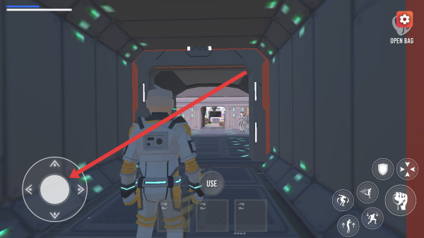 1、用左側搖桿控制移動,按箭頭指引方向,探索飛船走廊,靠近門互動USE,進入新區(qū)域。