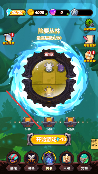 1、在主界面點擊險要叢林第1章關卡,按下開始游戲,進入策略戰(zhàn)斗模式,操控蝙蝠造型角色抵御怪物進攻波次。