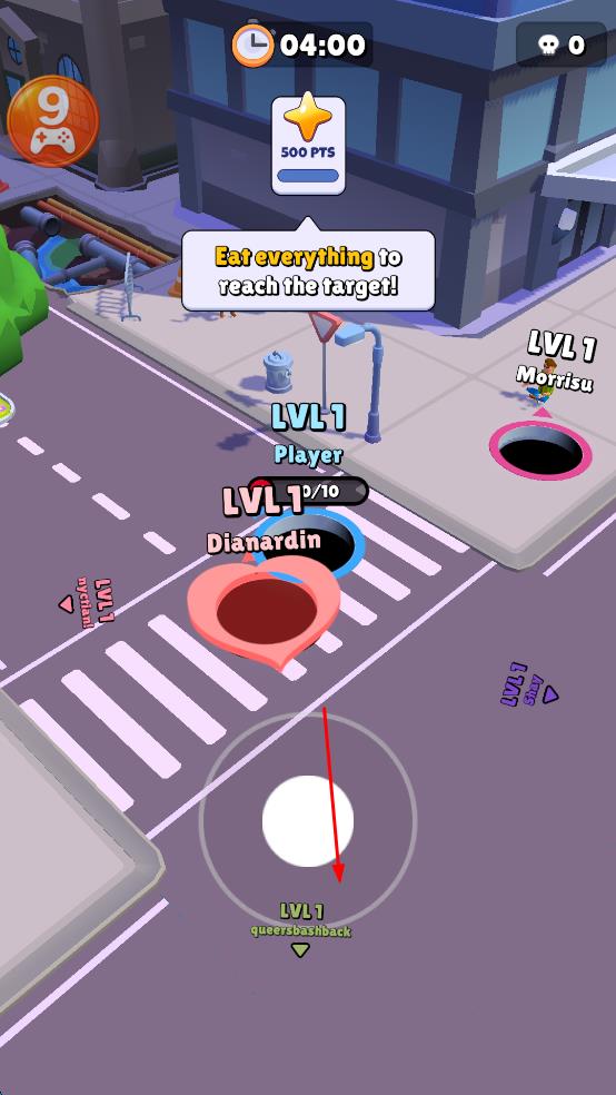 1、打開黑洞大作戰(zhàn)游戲,進入游戲后,操控黑洞在城市街道移動,吞噬周圍的物體,不斷擴大黑洞的等級,從LVL1開始逐步提升。