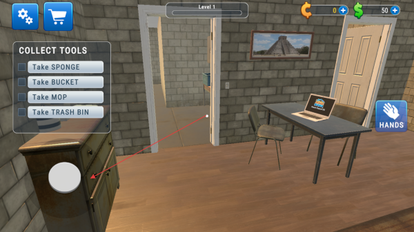 1、要點(diǎn)擊按左側(cè)的清單如SPONGE、BUCKET等,移動(dòng)角色到工具拖把、海綿處,點(diǎn)擊互動(dòng)拾取。