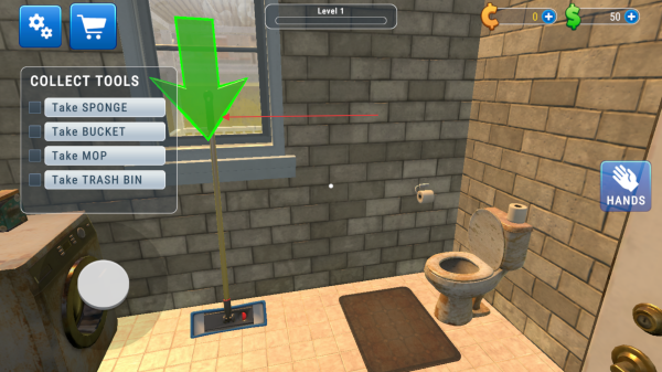 2、需要進(jìn)行清潔操作,轉(zhuǎn)移到衛(wèi)生間場景,用拾取的工具拖把拖地板、海綿擦污漬,對準(zhǔn)臟污區(qū)域點(diǎn)擊。