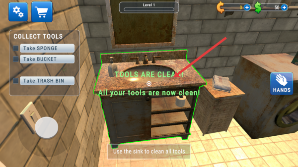 3、推進(jìn)任務(wù)的完成,以及工具收集、清潔步驟,觸發(fā)提示后,繼續(xù)清理房屋其他區(qū)域,積累金幣解鎖新任務(wù)。