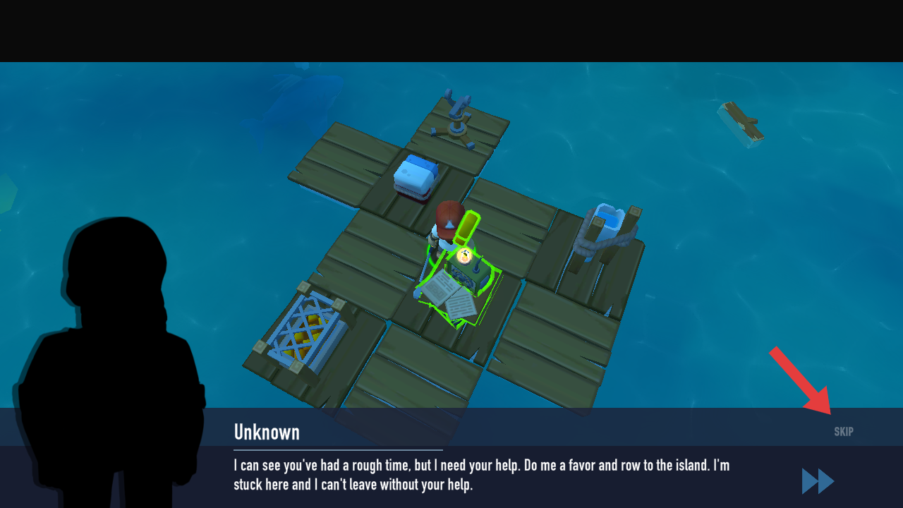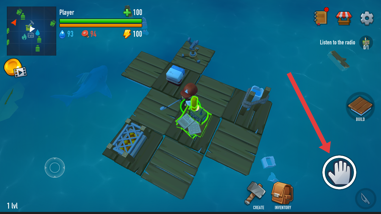 1、開局進入游戲,需要點擊屏幕右側(cè)手型的按鈕,與木筏上的裝置進行互動,觸發(fā)劇情任務(wù)。