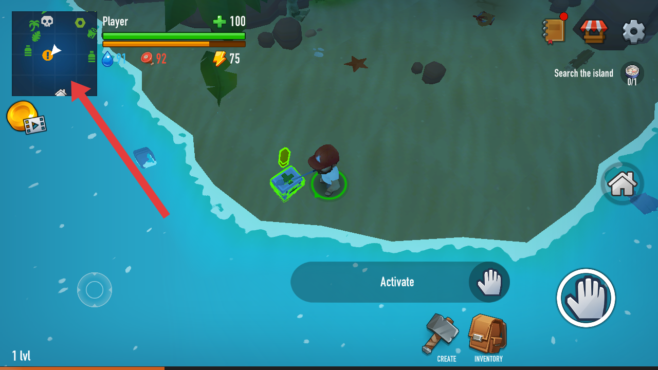 3、關(guān)注左上角地圖的區(qū)域,跟隨黃色感嘆號標(biāo)記,前往島嶼完成Search the island探索任務(wù)。