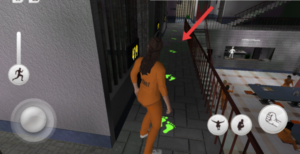 1、操控角色跟隨地面綠色腳印指引進(jìn)行移動(dòng),左側(cè)點(diǎn)擊跑步圖標(biāo)可以加速前進(jìn),探索監(jiān)獄的路徑。