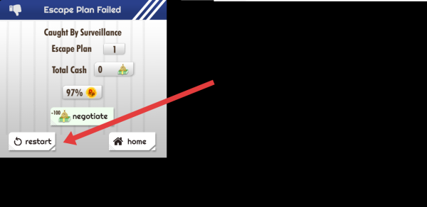 3、若逃脫失敗被紅色的監(jiān)控?zé)粽盏饺松恚枰c(diǎn)擊界面左下角restart的按鈕,重新開(kāi)始挑戰(zhàn)。