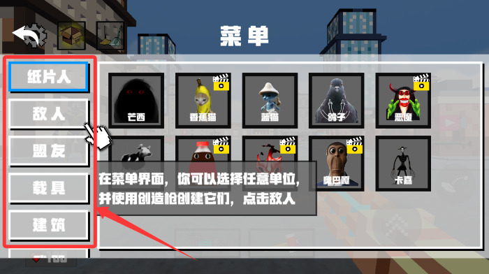 4、通過菜單中的"紙片人""敵人"等選項(xiàng),使用生成工具放置實(shí)體,依照指引體驗(yàn)內(nèi)容。