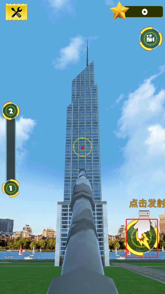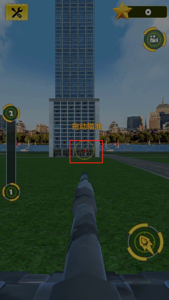 1、開(kāi)局通過(guò)拖動(dòng)屏幕來(lái)靈活調(diào)整瞄準(zhǔn)環(huán)的位置與角度,仔細(xì)對(duì)準(zhǔn)前方高樓的薄弱區(qū)域,根據(jù)建筑結(jié)構(gòu)規(guī)劃炮彈的精準(zhǔn)打擊落點(diǎn)。