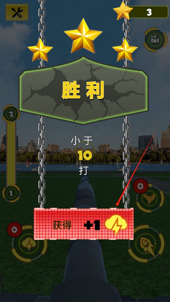 3、當(dāng)高樓完全被摧毀后,界面會(huì)彈出任務(wù)完成的勝利提示,同時(shí)獲取閃電形狀的道具獎(jiǎng)勵(lì),該道具可用于提升武器威力或解鎖新功能。
