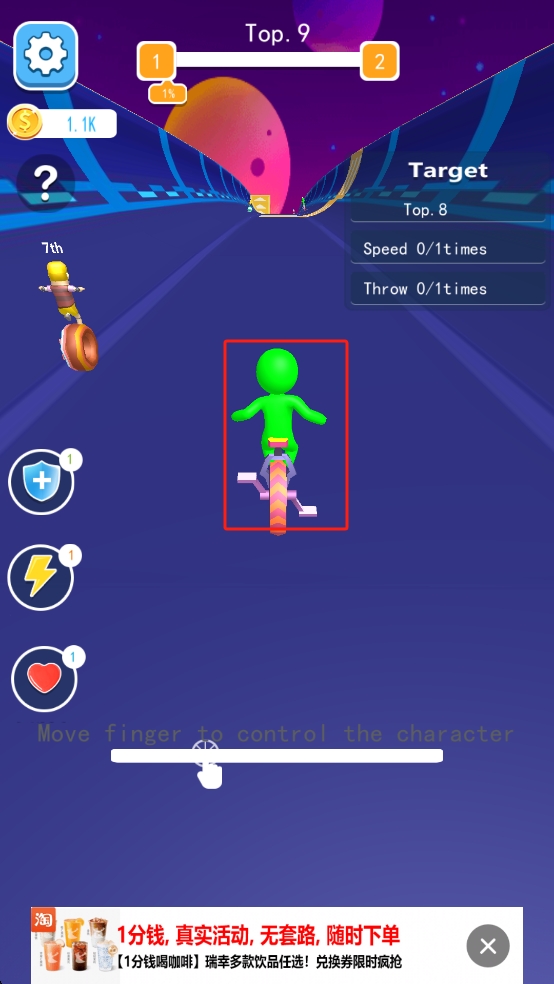 1、在賽道場景中通過滑動屏幕控制綠色小人騎行獨(dú)輪車,靈活調(diào)整方向,避讓其他選手,朝著賽道前方行進(jìn)。