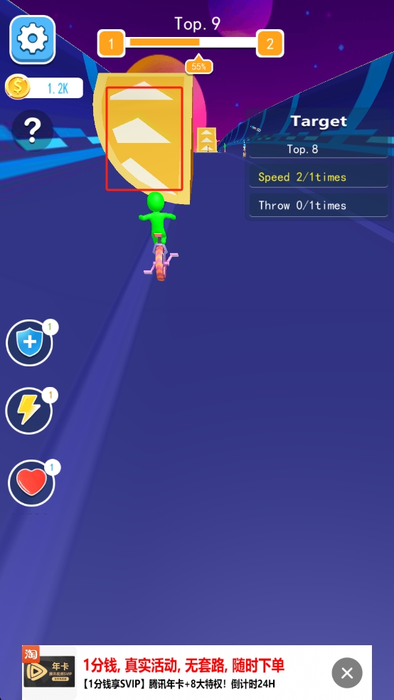 2、引導(dǎo)角色撞擊黃色加速道具,觸發(fā)加速效果提升速度,同時留意右側(cè)目標(biāo)任務(wù),按要求完成速度提升等操作。
