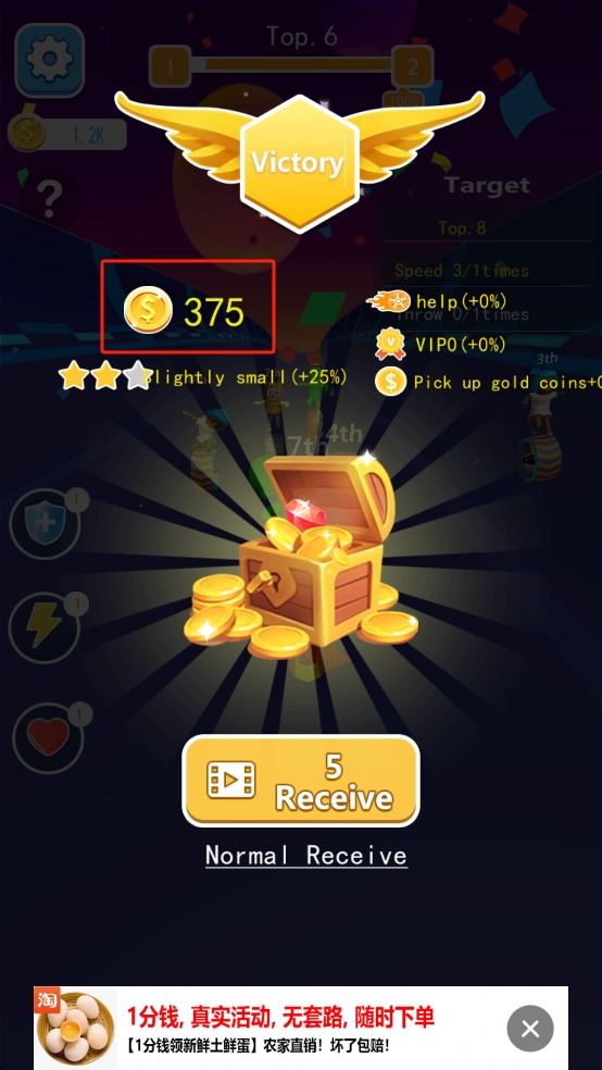 3、沖過終點(diǎn)后,界面顯示勝利結(jié)算,獲取375金幣獎勵,點(diǎn)擊下方按鈕直接領(lǐng)取或觀看廣告使獎勵翻倍。