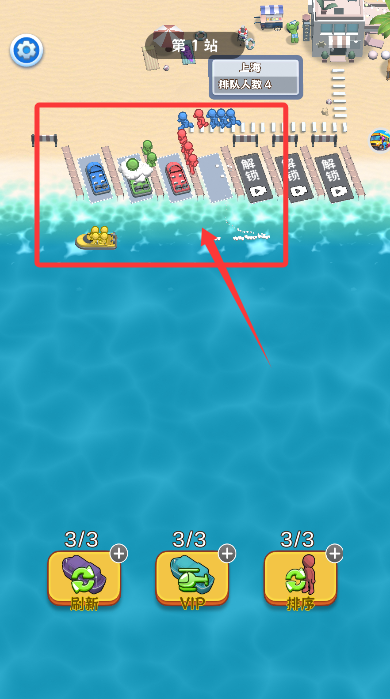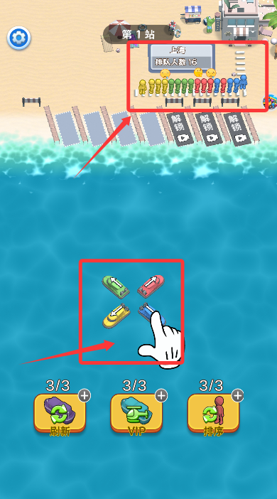 2、觀察候船乘客服飾顏色,將同色系小船拖至對應(yīng)人群接載。