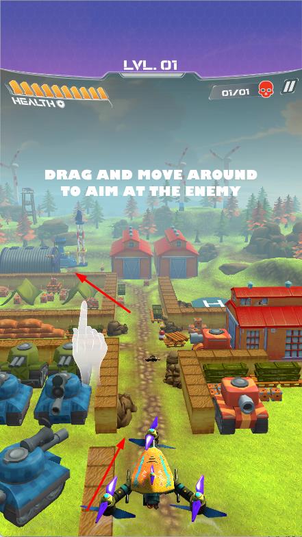 2、通過(guò)手指拖動(dòng)屏幕,控制無(wú)人機(jī)的移動(dòng)方向,瞄準(zhǔn)敵人,觀(guān)察屏幕上方顯示的生命值和關(guān)卡進(jìn)度。